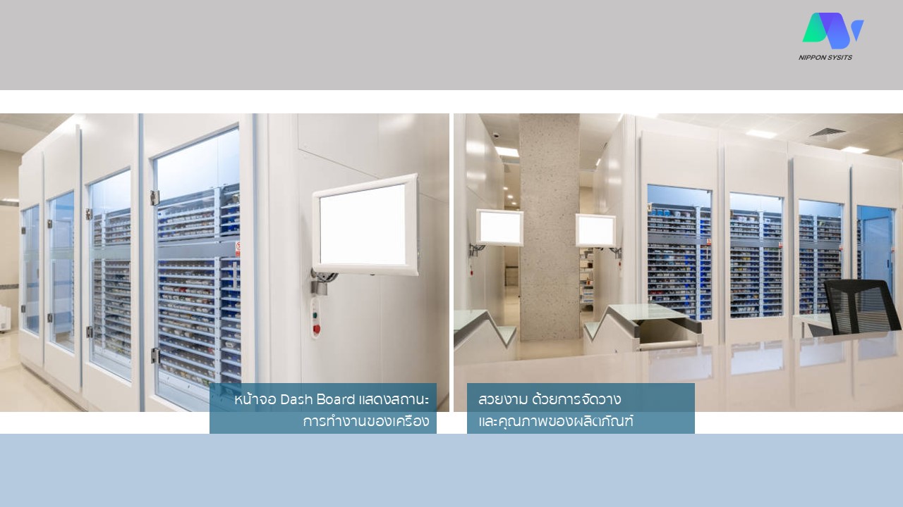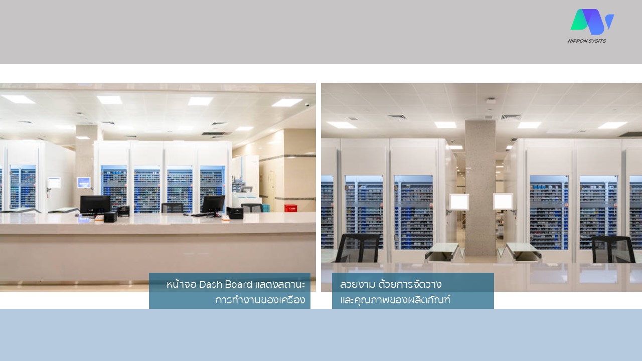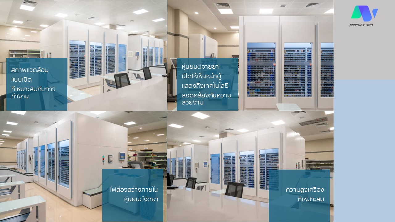 - ตู้ยาอัจฉริยะ: จัดยาได้หลายชนิดพร้อมกัน จุยาสูงสุดได้ถึง 15,000 กล่องยา